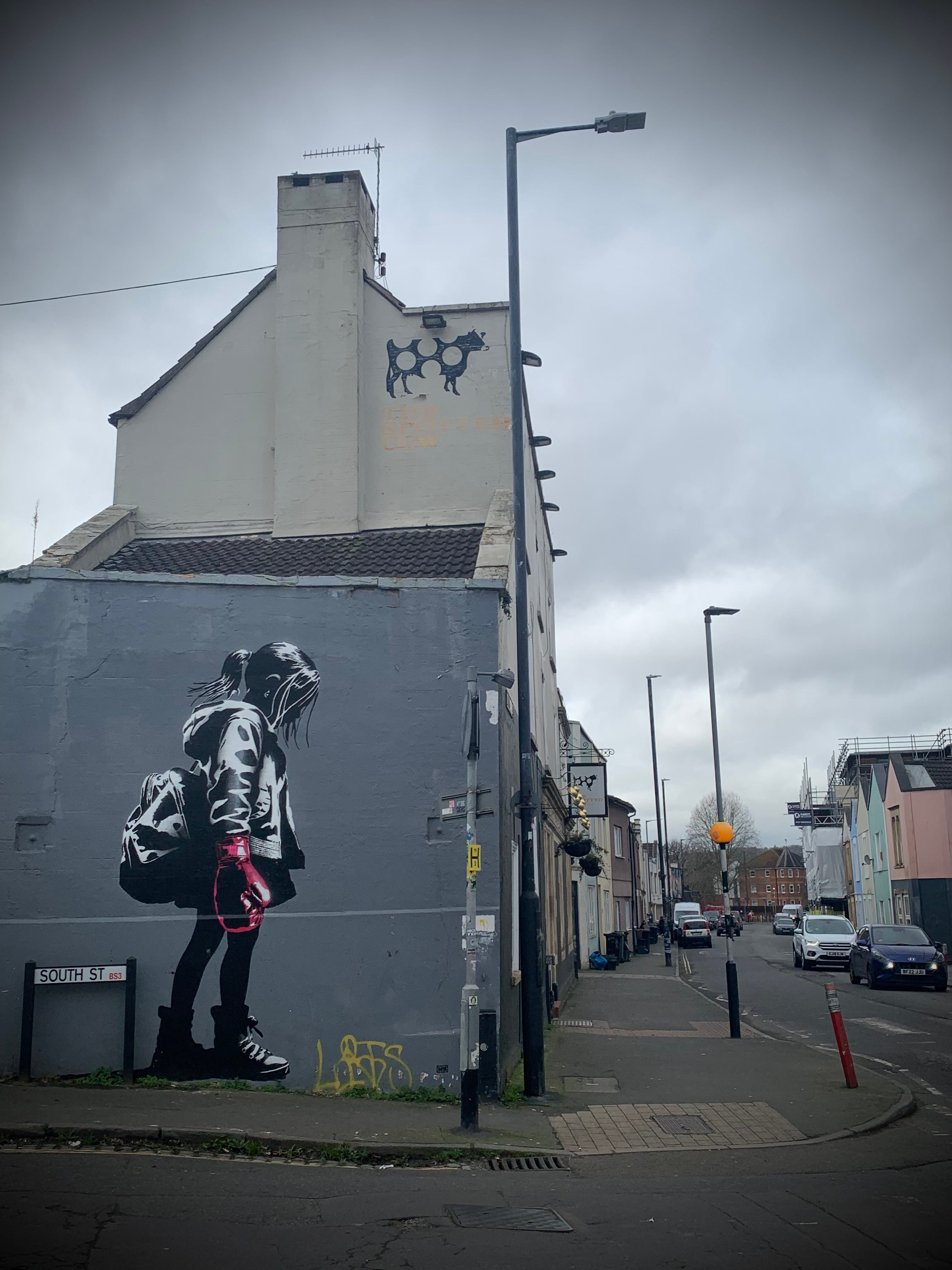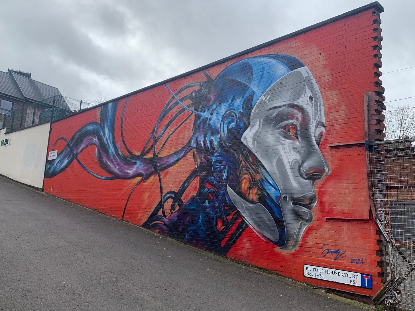 It is in that spirit of Eros and Awen that I am present for the sun that’s peeked out twice since I’ve been in Bristol, the warmth on my skin, the free art given to us by Banksy (and other equally talented, but lesser known artists) as murals across England,